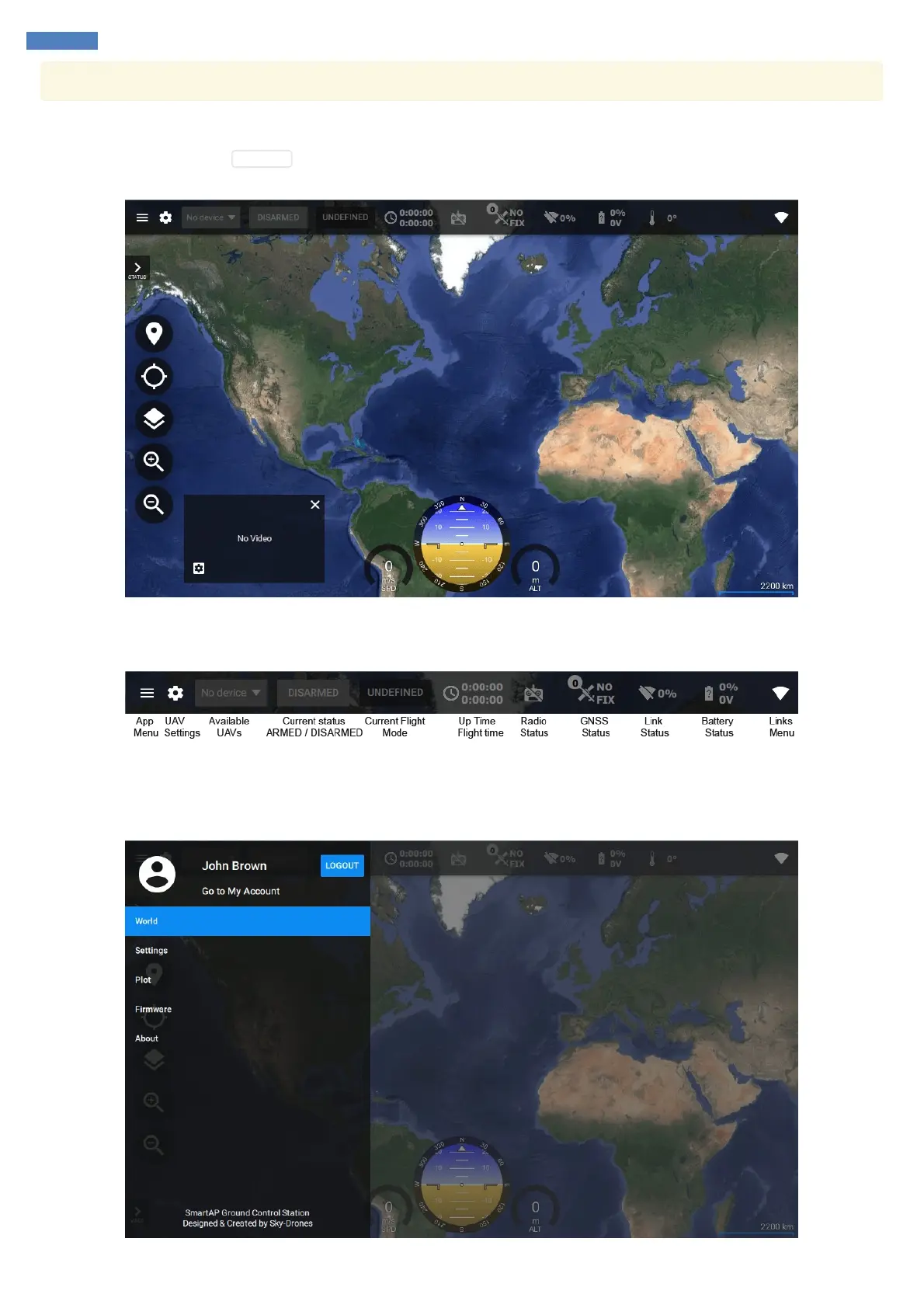 World pane provides all necessary information about the flight and allows controlling the flight modes and planning the mission.