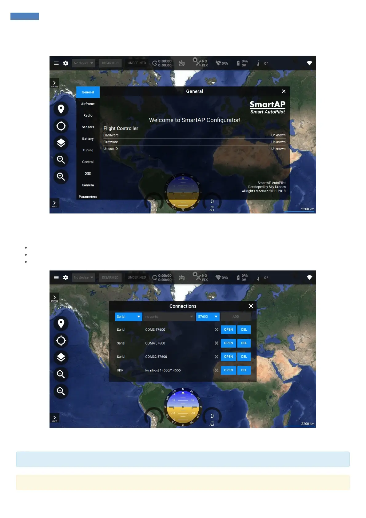 Clicking the gear will open UAV settings menu. The main tab shows information concerning hardware, installed firmware and unique ID. Tabs at
