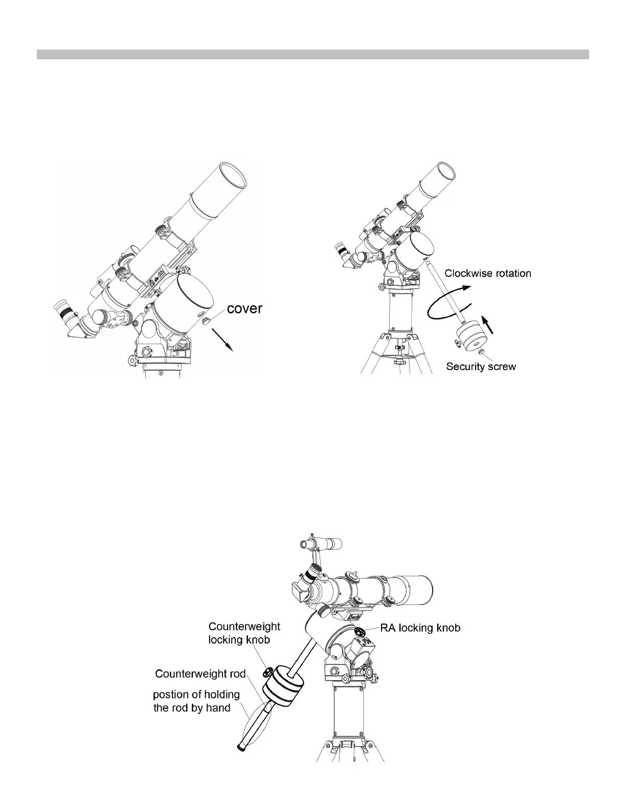 3. Remove the security cap on the rod. Slide the counterweight onto the rod and tighten the locking knob. Thread in