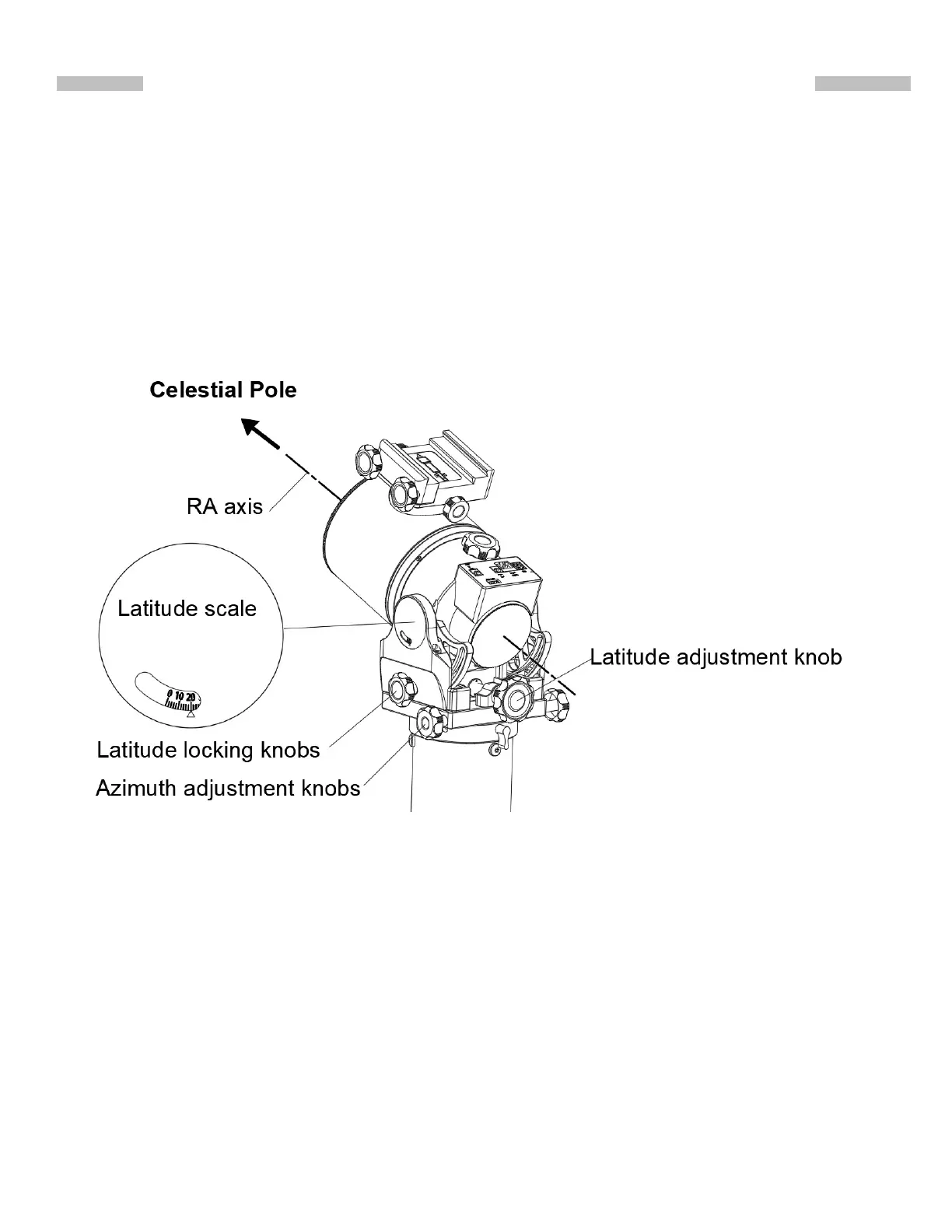 5.Use the altitude (or latitude) adjustment knob to fine tune the tilt of the R.A. axis. Use the