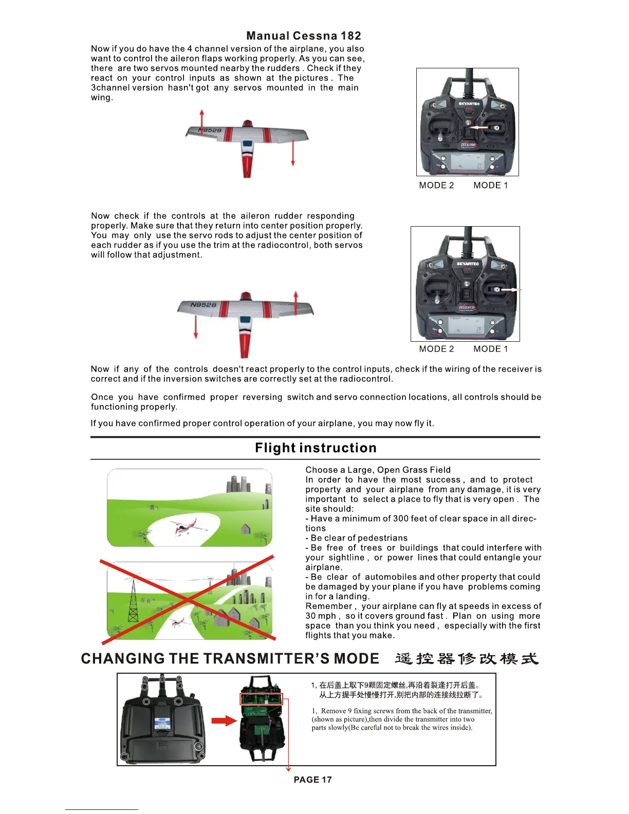 SkyArtec Cessna 182 - Flight Operations and Transmitter Configuration; Flight Instruction Guidelines; Changing Transmitter Mode