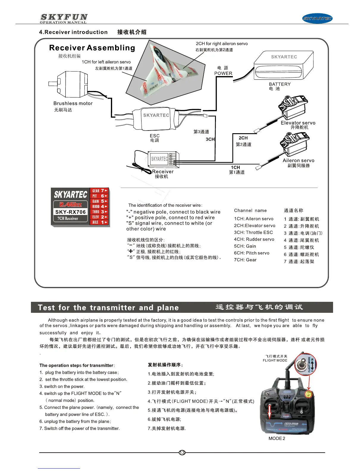 SkyArtec Skyfun - Receiver Introduction; Receiver Assembling and Wiring; Transmitter and Plane Test; Transmitter Operation Steps