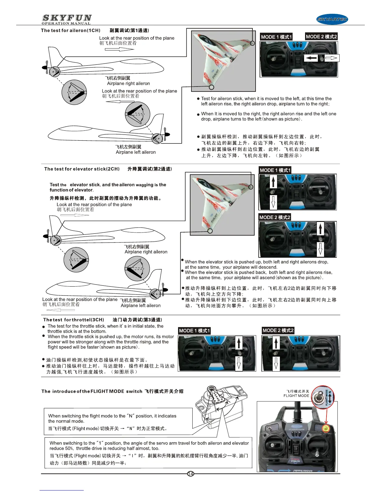 SkyArtec Skyfun - Control Surface Testing; Aileron Test (1 CH); Elevator Test (2 CH); Throttle Test (3 CH)