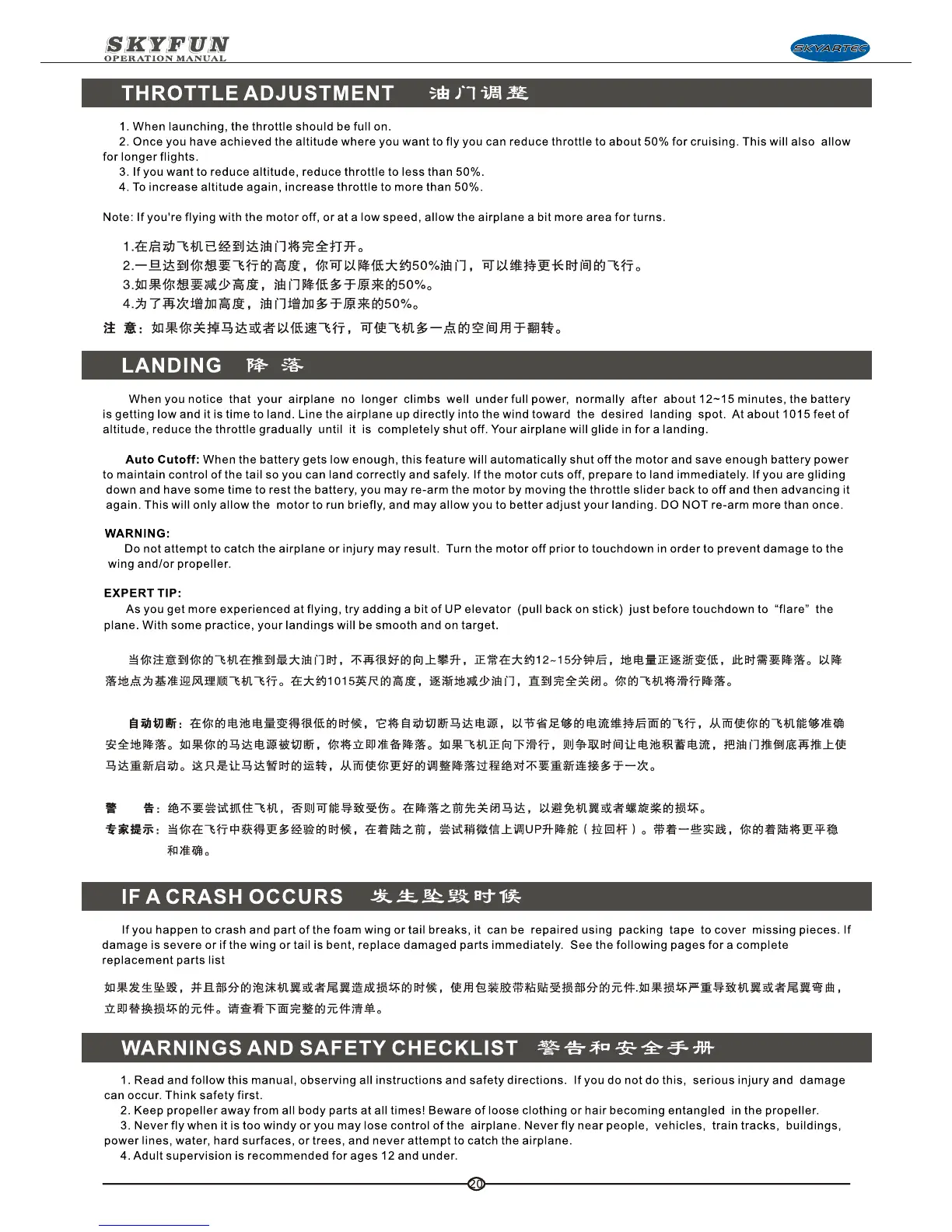 SkyArtec Skyfun - Throttle Adjustment; Landing Procedures; Landing Guidance and Tips; Crash Repair Instructions
