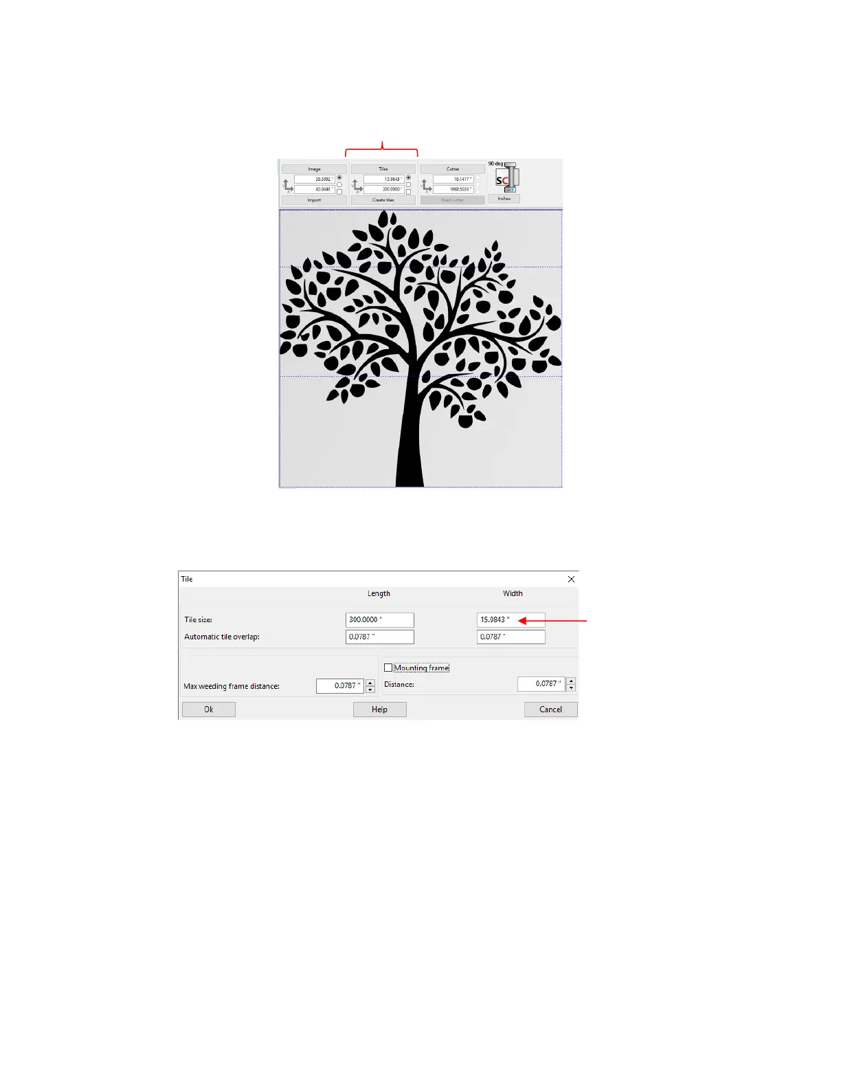 individual tiles based on dimensions entered. In this example, a large tree design will be tiled for application