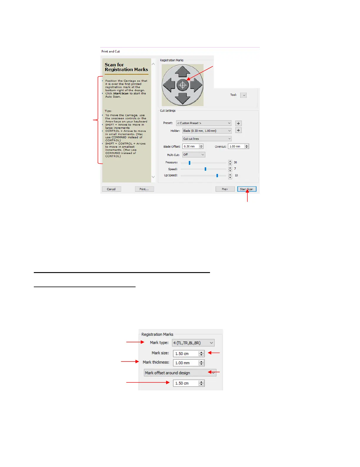• You have some control over the size and location of the registration marks. Under Cutter>Cutter Settings,