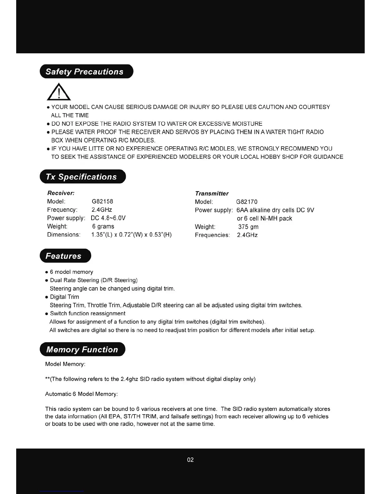 Skyion SID-3 - Safety Precautions; General Safety Warnings; Tx Specifications; Receiver and Transmitter Details