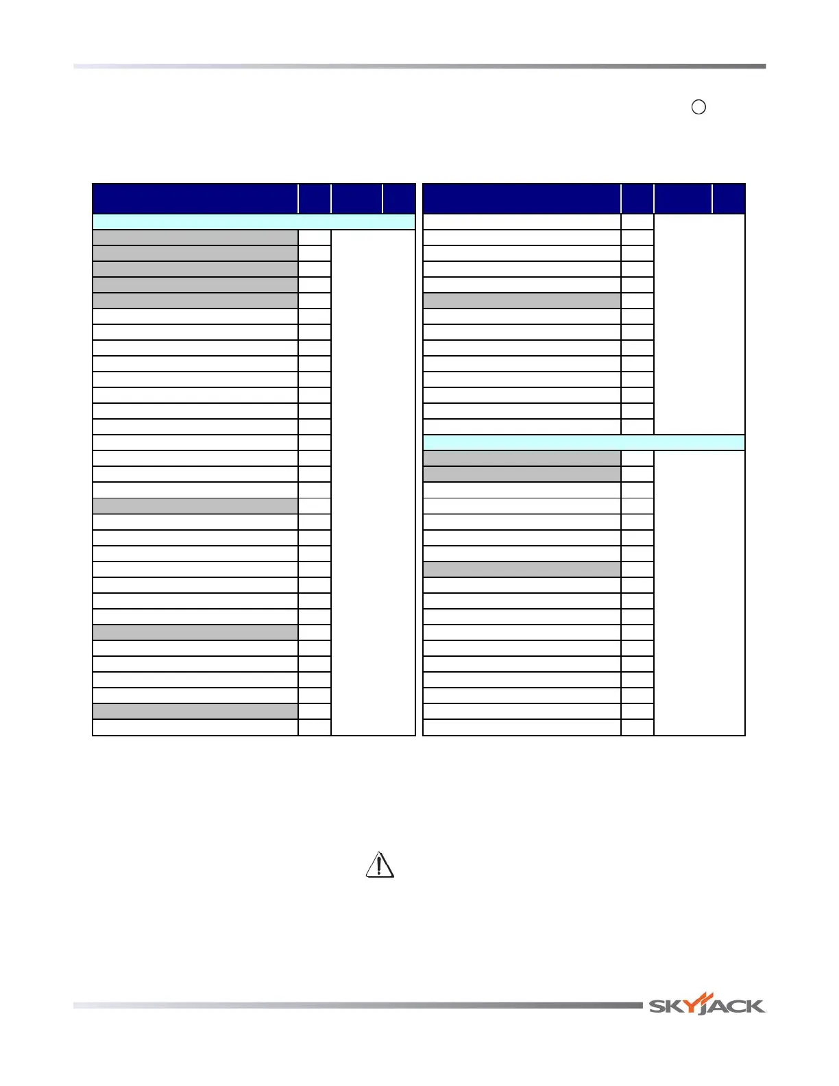 † - Refer to Skyjack's website @ www.skyjack.com for latest service bulletins proior to performing quarterly or yearly inspection.