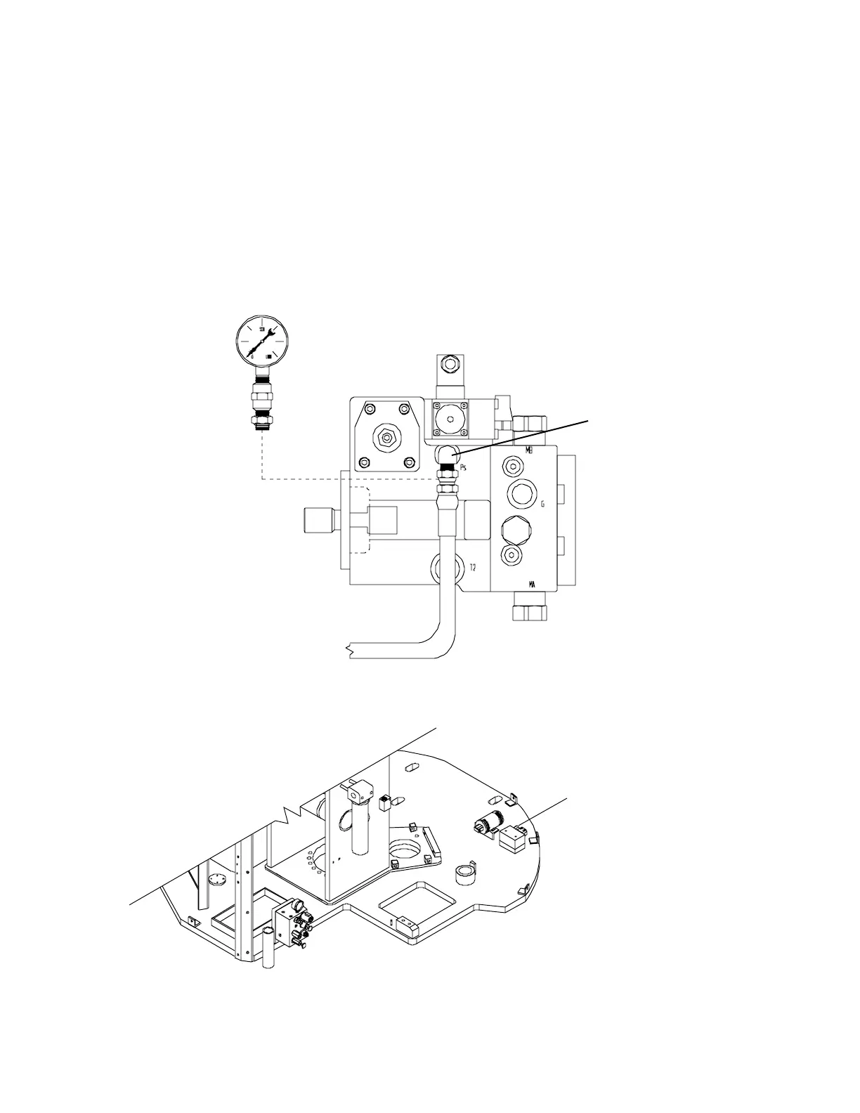 2) Tee a 1000 PSI gauge into the port marked Ps on the drive pump. Refer to Figure 5-17.