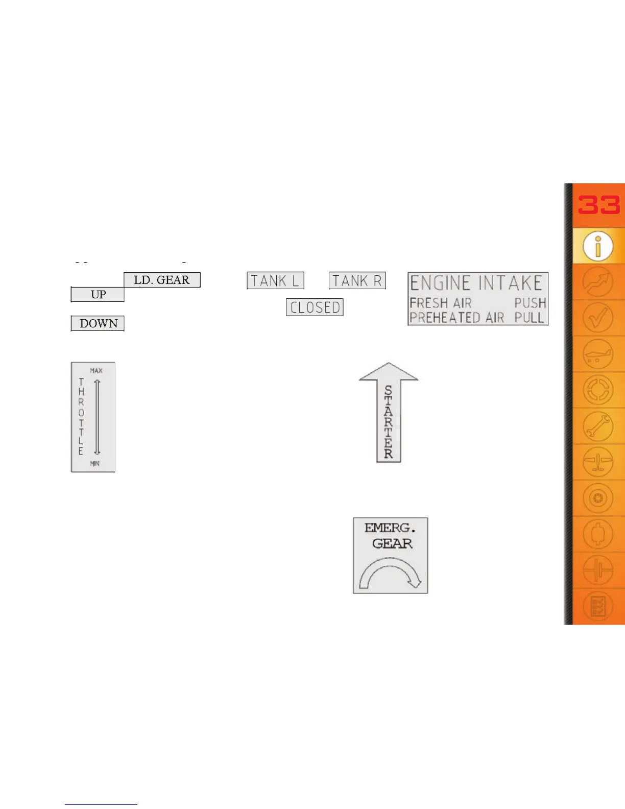 - landing gear lever (retractable gear only!) : - fuel cock: - engine intake: