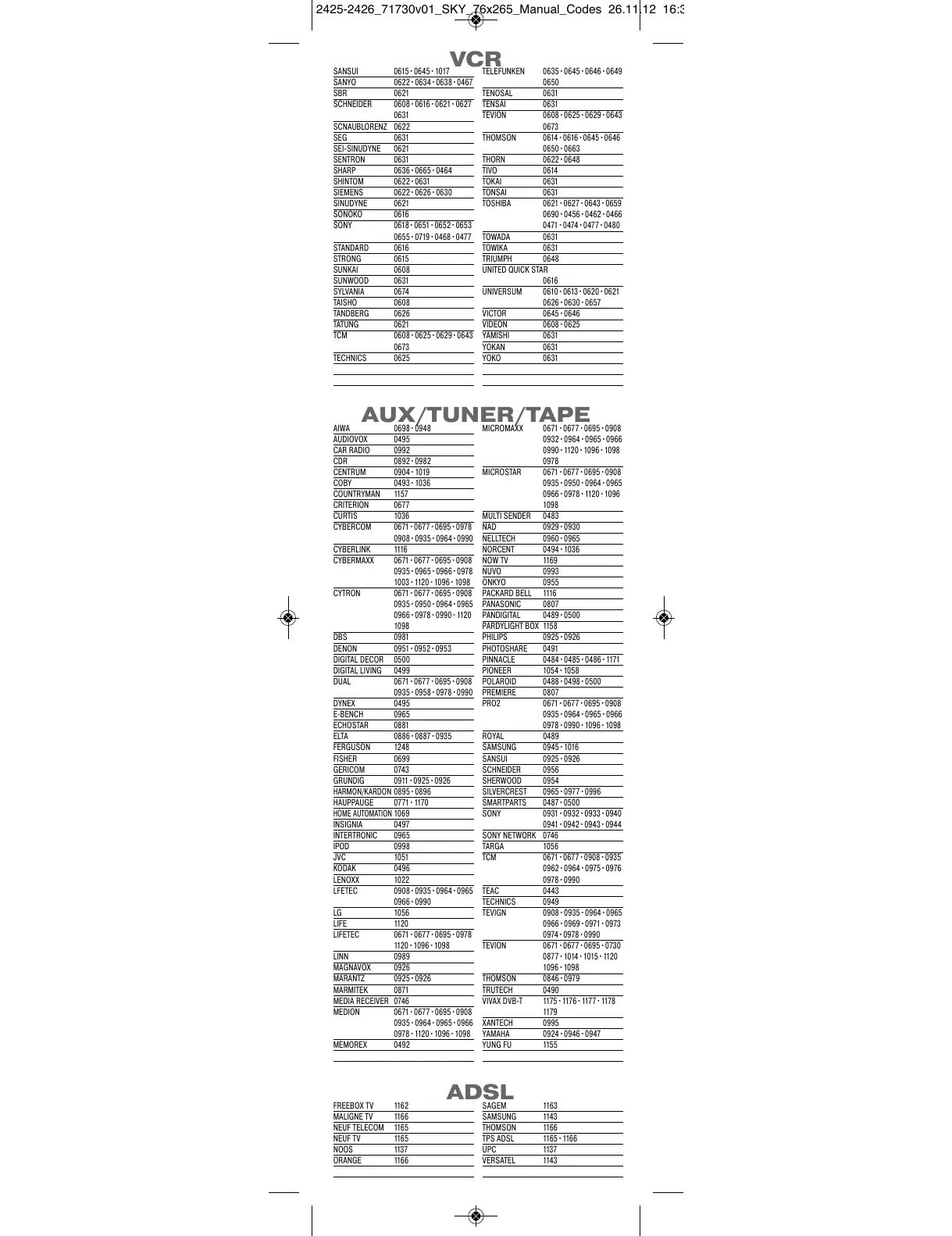Skymaster 2425 - AUX;Tuner;Tape Codes; ADSL Codes