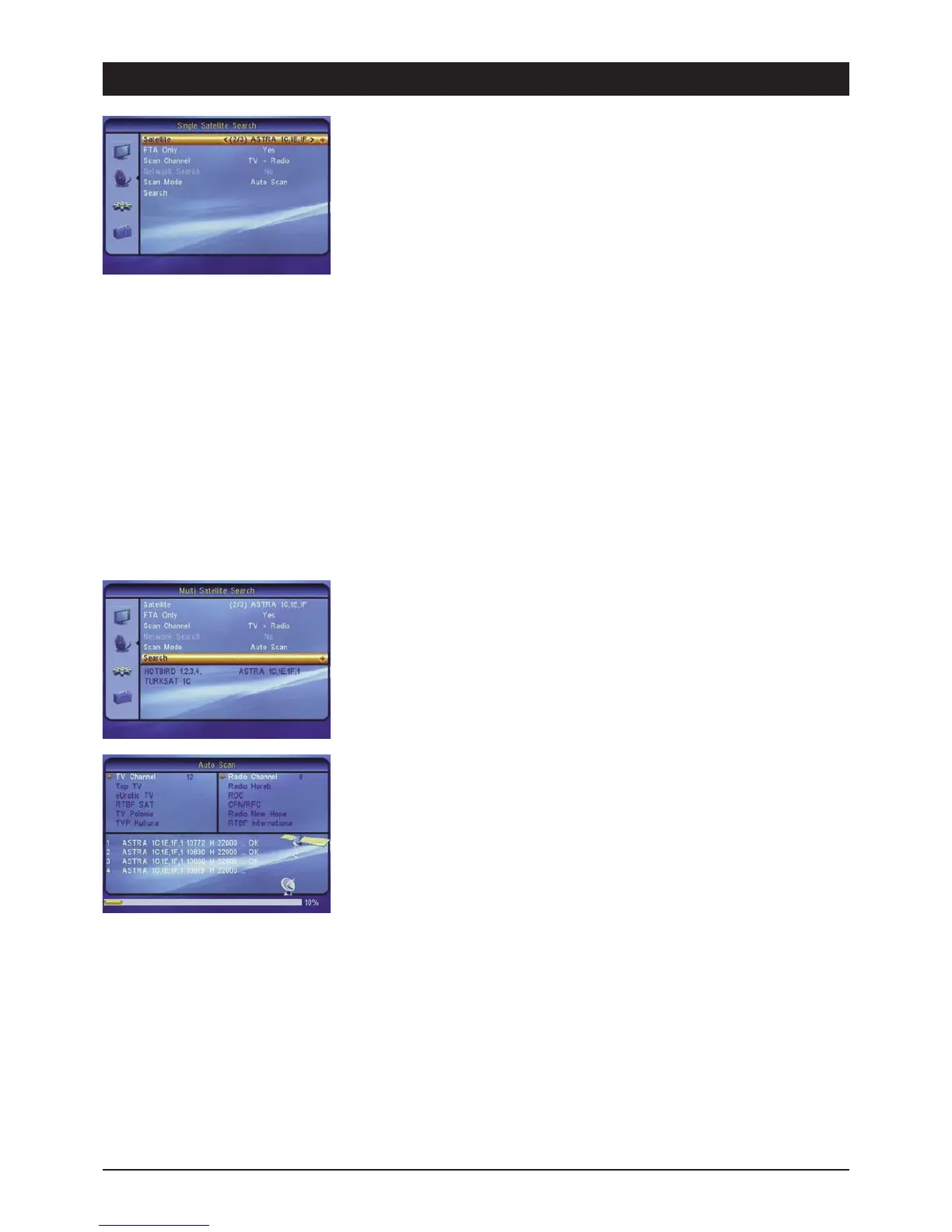 Autom. search Automatic search of all the available transponders of a satellite position.