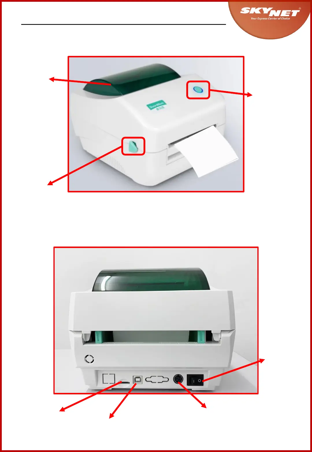 Skynet SoonMark M8 - Printer Components Identification; Front View Component Details; Rear View Component Details