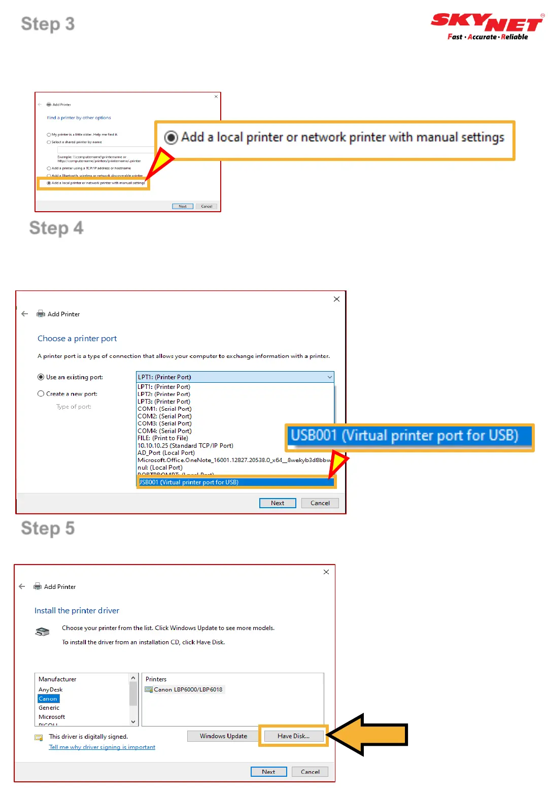 Click Use an existing port’ and choose ‘USB001