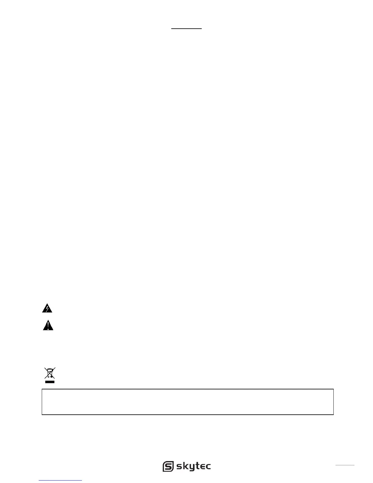 contained in this manual. Skytec cannot be held responsible for personal injuries caused by a disrespect of the safety recommendations