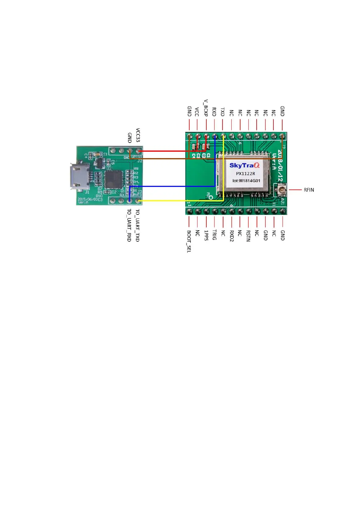 Hook up as below; connect to an UART-to-USB bridge breakout board for connecting to GNSS