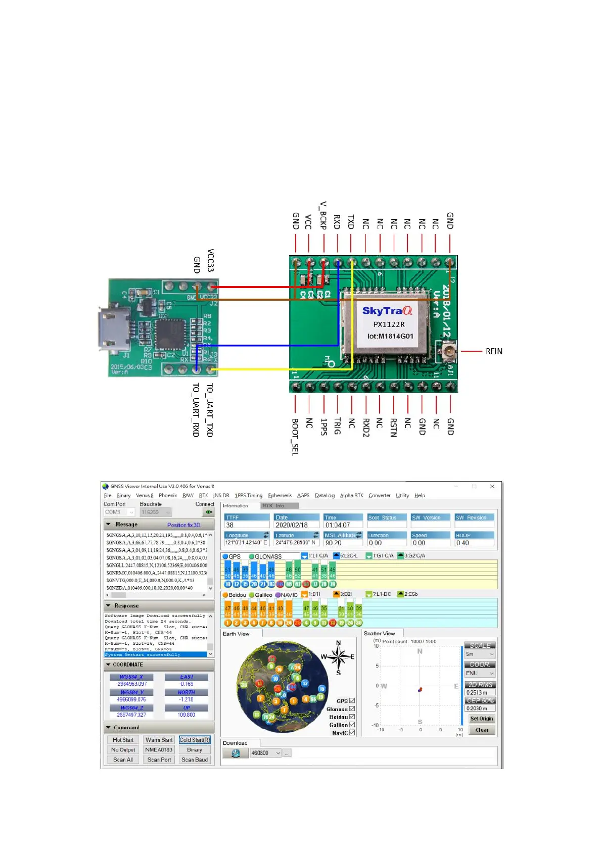 been installed, select proper COM port and 115200 baud rate on GNSS Viewer, click CLOSE, GNSS