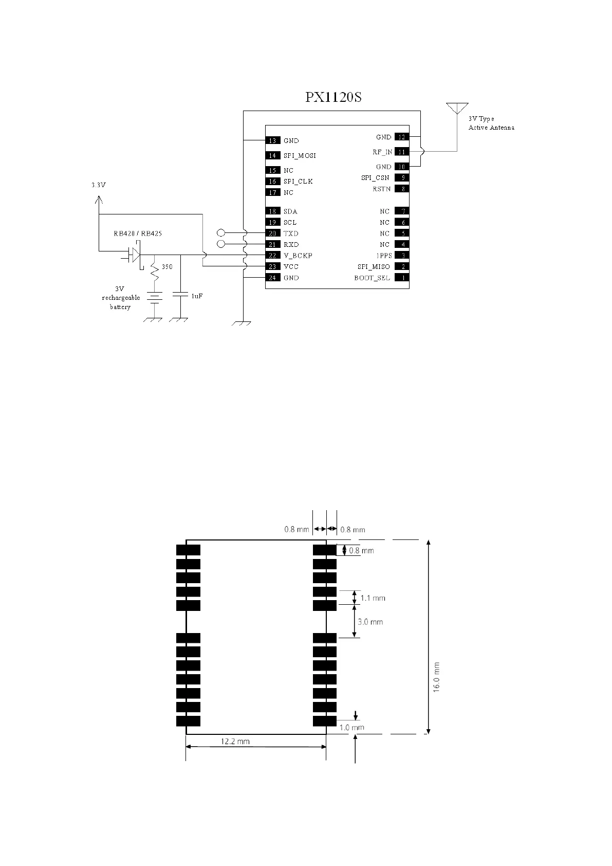 SkyTraq PX1125S-01B - APPLICATION CIRCUIT; Recommended Circuitry; PRECOMMENDED LAYOUT PAD; PCB Pad Design