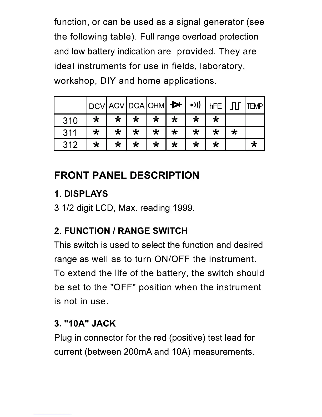 SKYTRONIC Digital Multimeter - Front Panel Description; Displays; Function; Range Switch; 10 A Jack