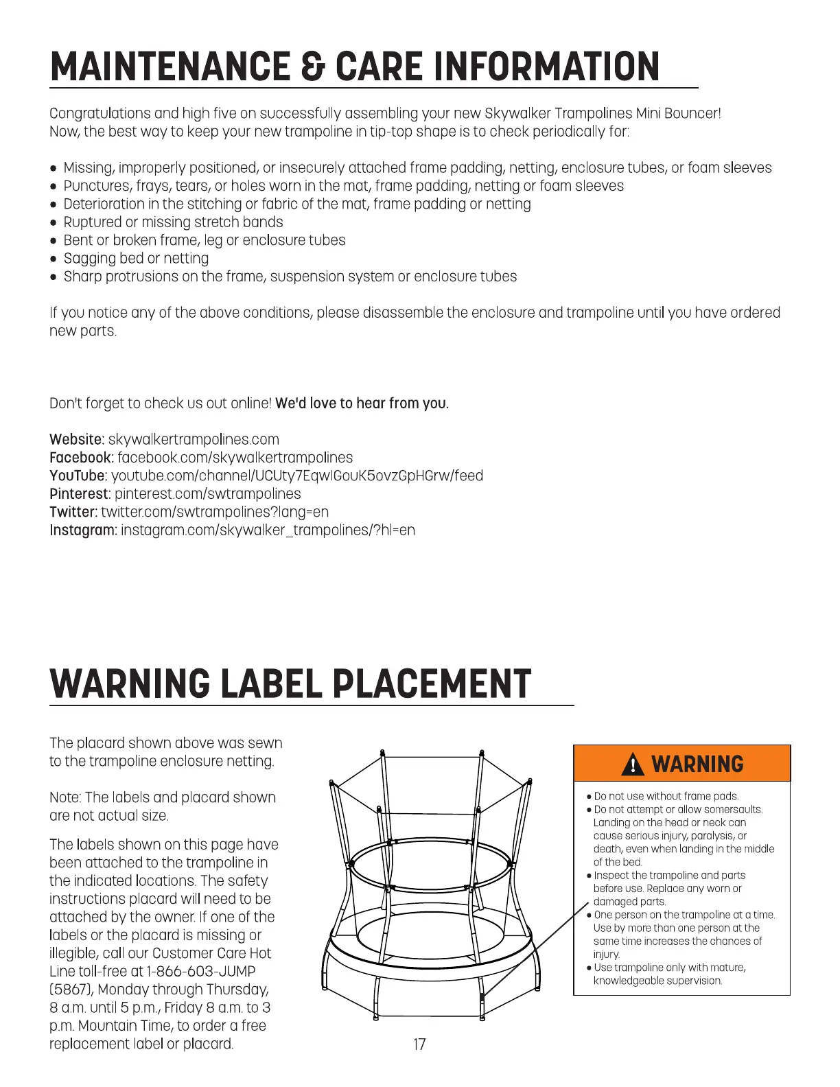 Skywalker Safari Explorer - Maintenance & Care Information; Warning Label Placement
