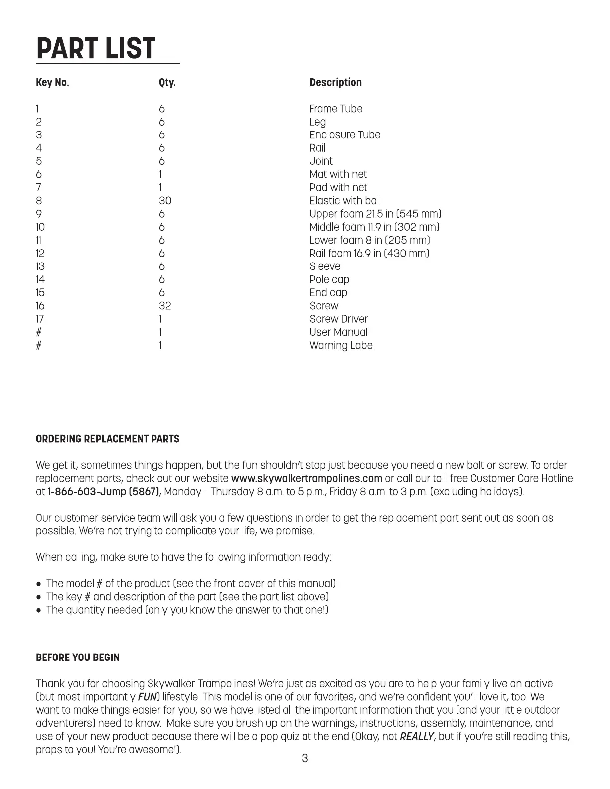 Skywalker Safari Explorer - Part List; Ordering Replacement Parts; Before You Begin