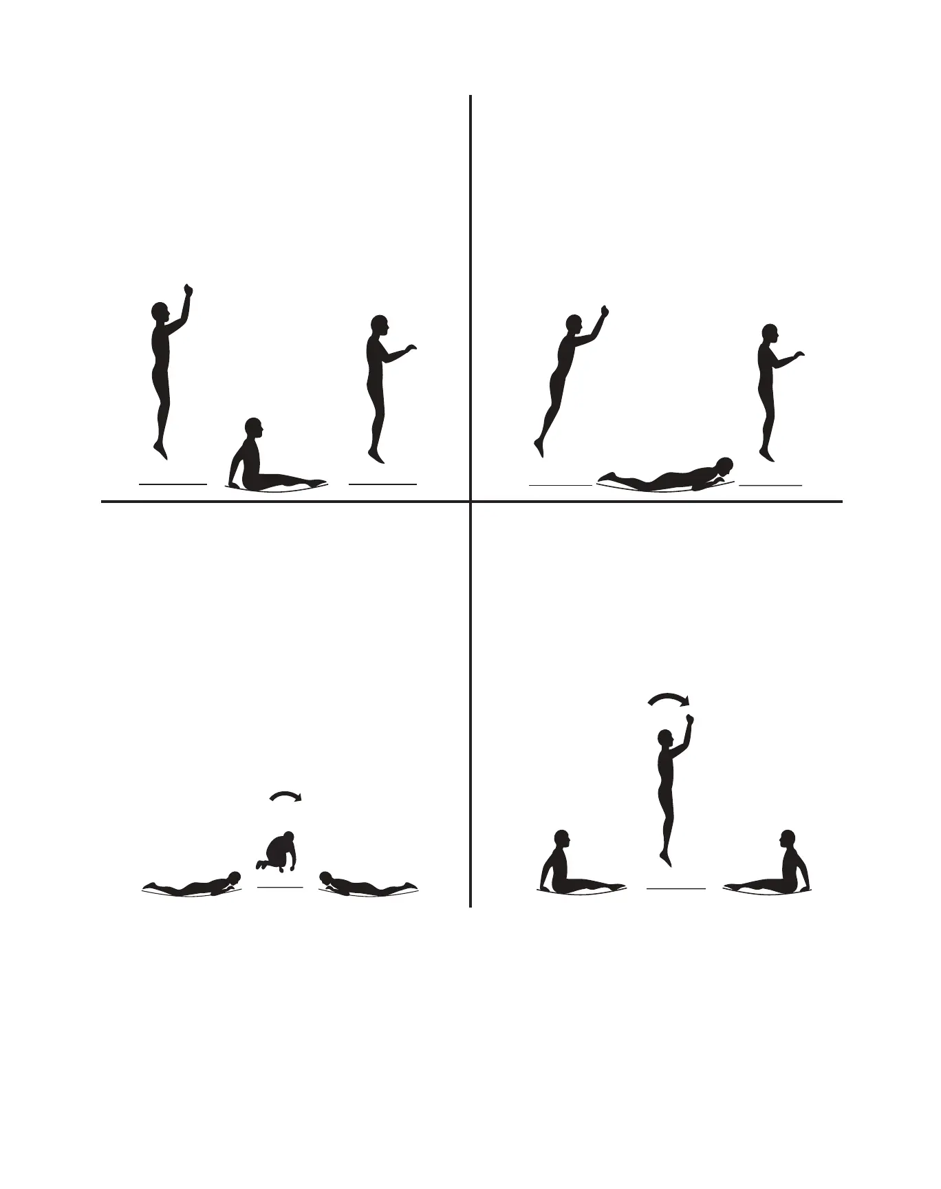 seat drop, half twist to feet, repeat; seat drop, half twist to seat