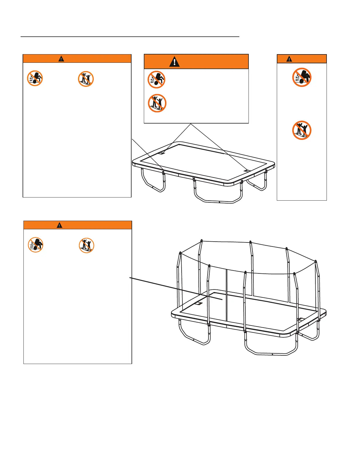 Do not jump from other objects, buildings, or surfaces, onto the trampoline, or into or over the trampoline enclosure.