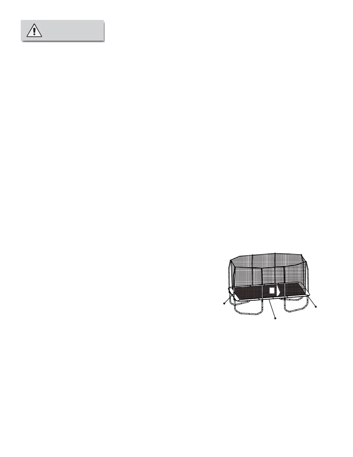 Inspect the trampoline enclosure before each use, and replace any worn, defective, or missing parts. The following