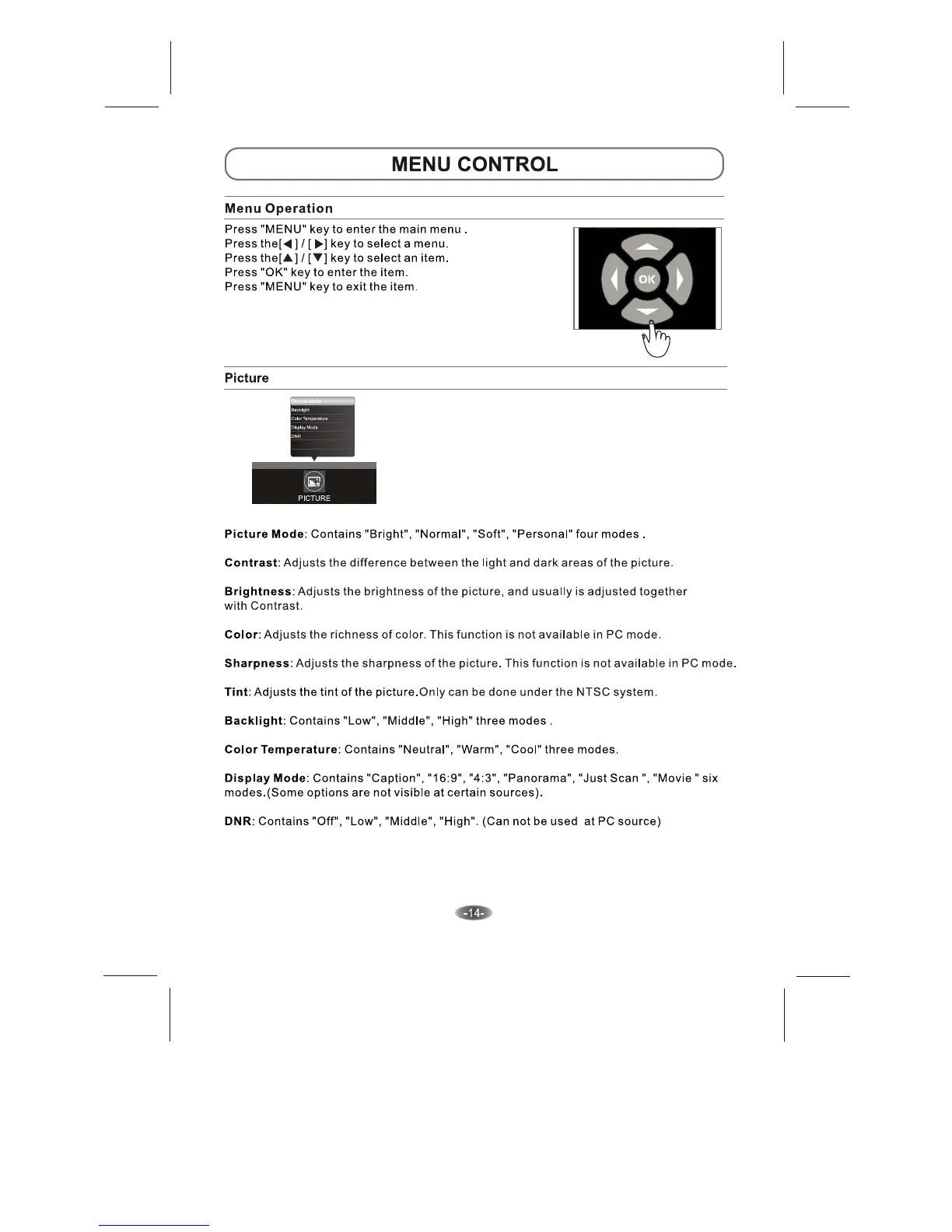 Skyworth 42E38 - MENU CONTROL; Menu Navigation Basics; Picture Settings Adjustment
