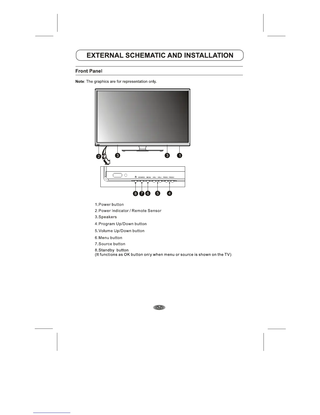 Skyworth 42E38 - EXTERNAL SCHEMATIC AND INSTALLATION; Front Panel Overview