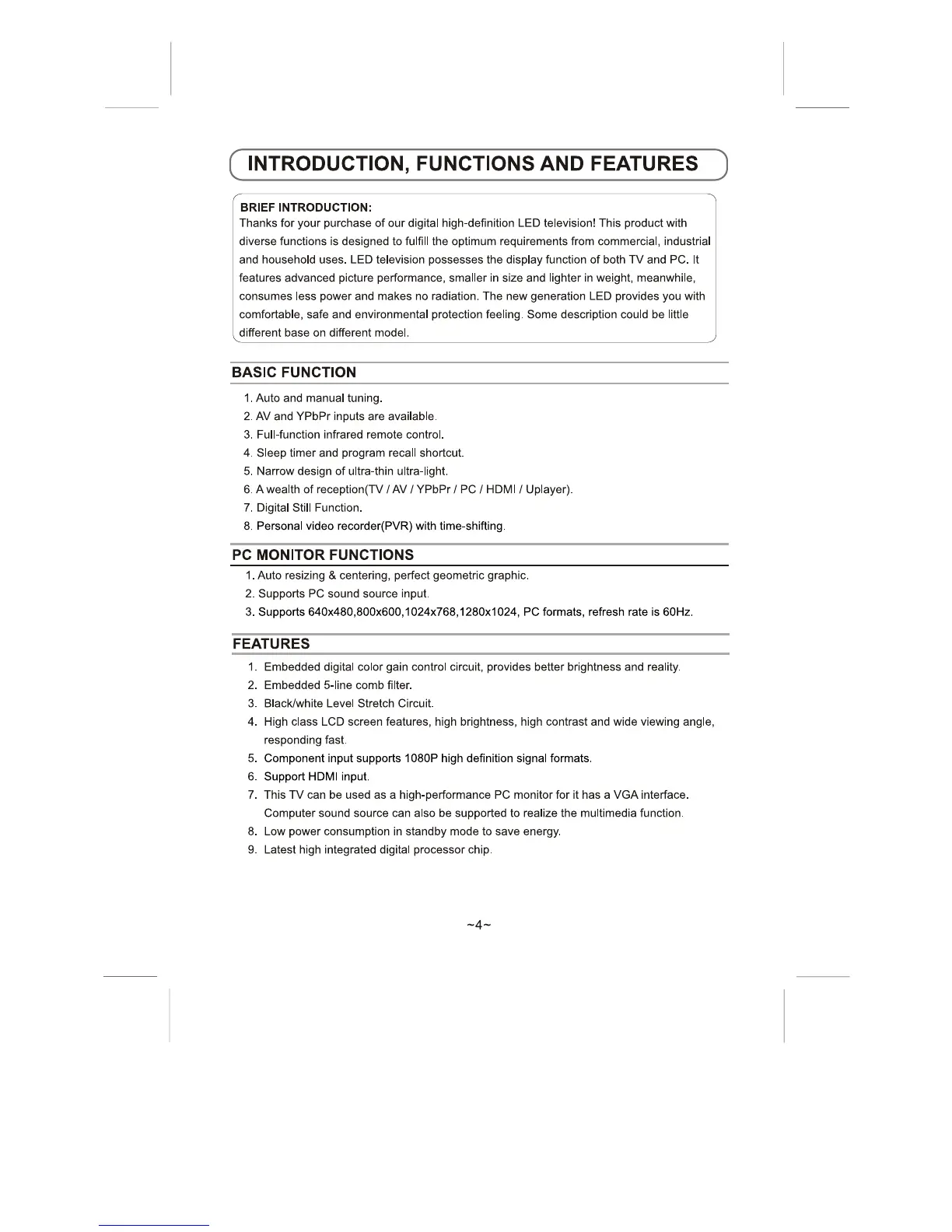 Skyworth LED-42E60 - Brief Introduction; Basic Function; PC Monitor Functions; Features