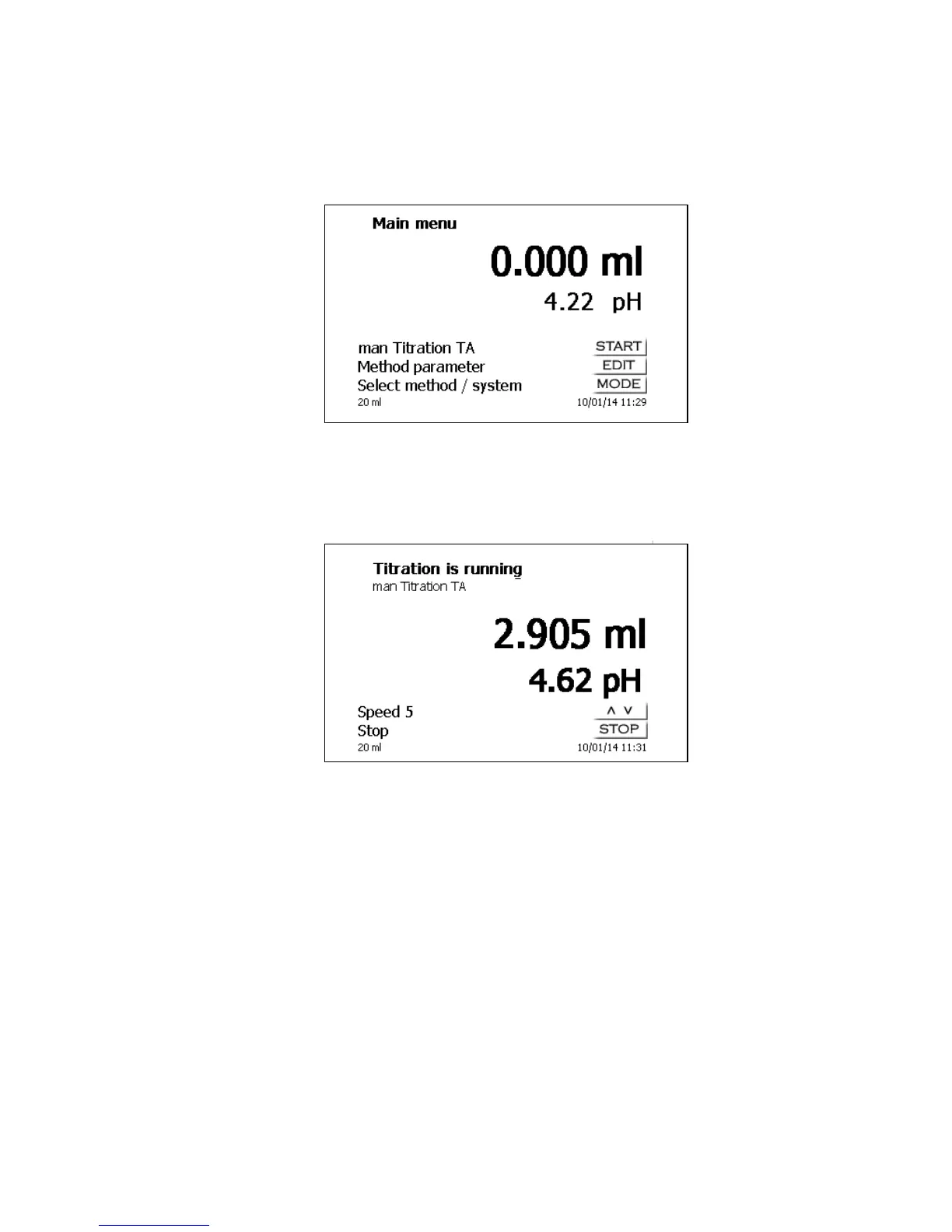 Using <START>/<F1> or pressing the black key on the “mouse“ will start the manual titration method.