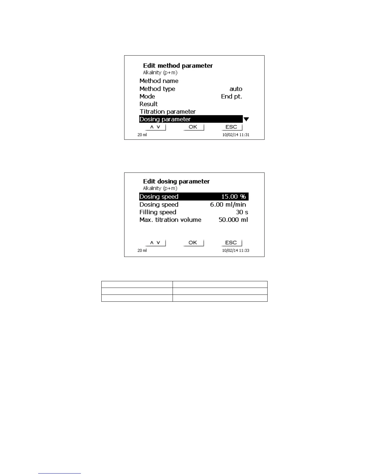 The dosing parameters (dosing speed, filling speed and max. dosing/titration volume) are determined