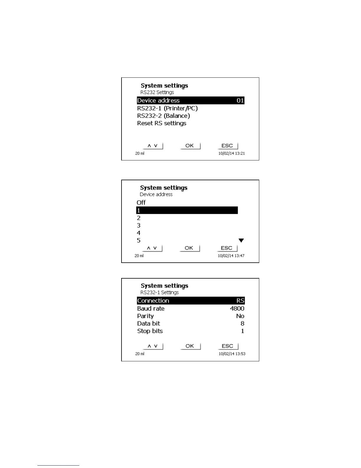 The <RS232 settings> item can be used to determine the device address of the TitroLine® 5000 and