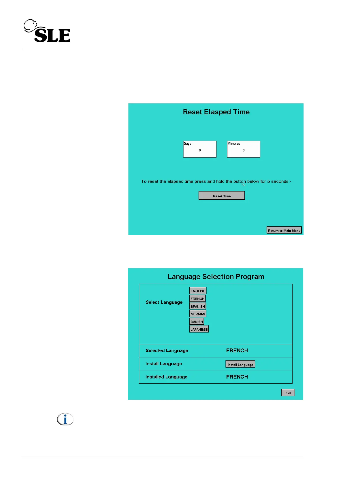 SLE SLE5000 Model J - Reset Elapsed Time; Language Selection