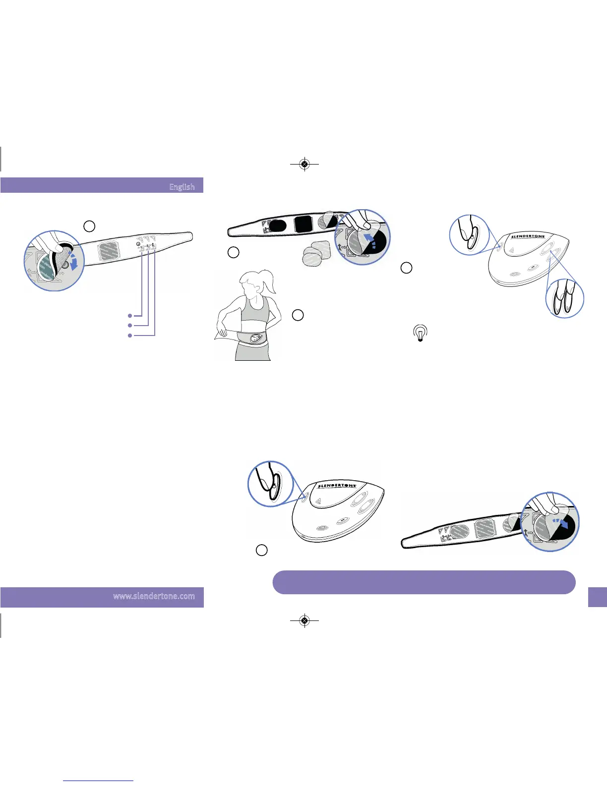 Step 4: Position the pads on the belt. Step 5: Remove covers (from black side). Step 7: Switch on your unit.
