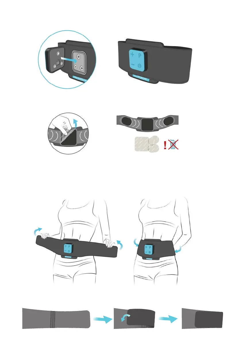 Póngase el cinturón alrededor de la cintura presionando firmemente los electrodos sobre la piel, colocando el
