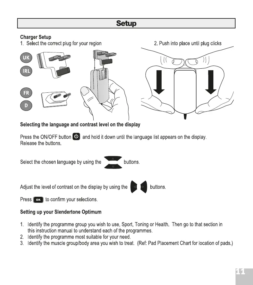 Slendertone Optimum - Setup; Charger Setup; Selecting the language and contrast level on the display; Setting up your Slendertone Optimum