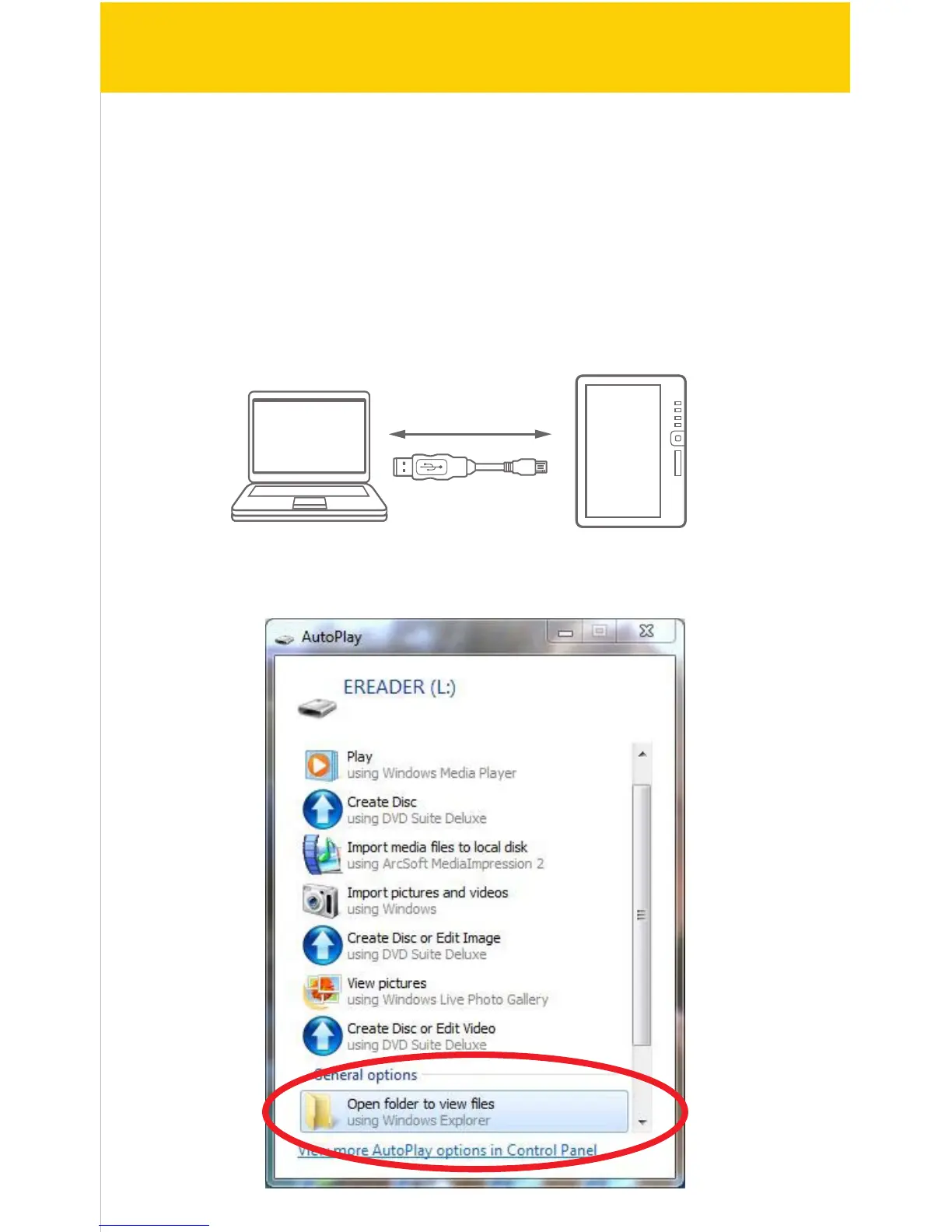 2. Connect the e-Reader to the computer using the included USB cable.