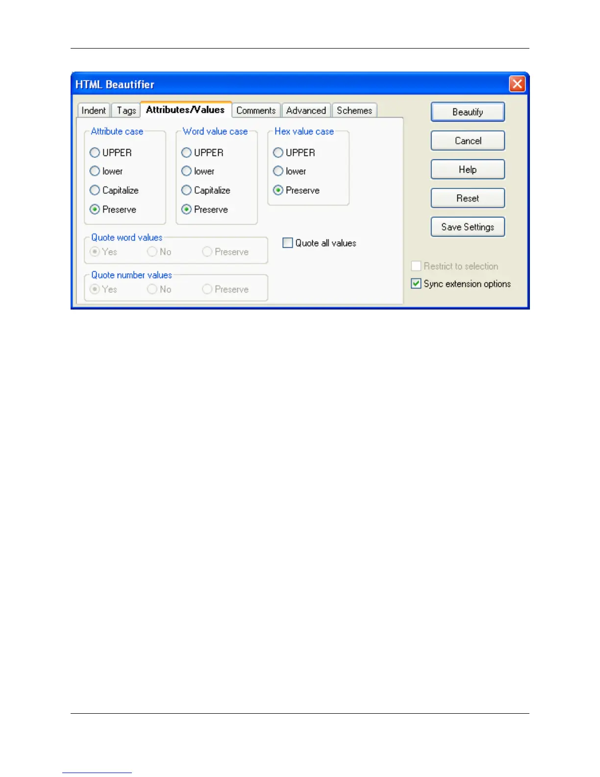 • Word value case - Specifies how you want word values cased after the = of an attribute inside the