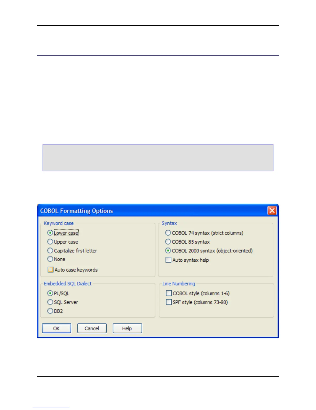 Languages similar to COBOL have similar Formatting Options dialogs which are not specifically