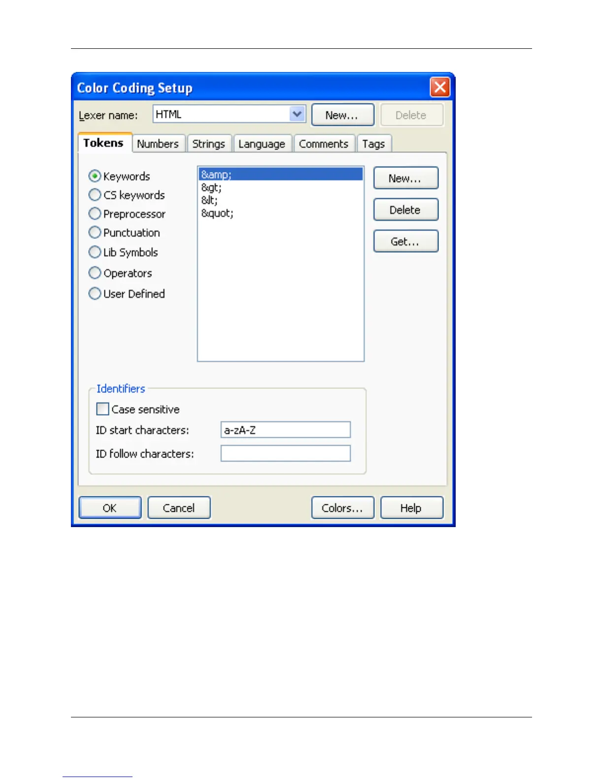 • Preprocessor - When this option is selected, the list box to the right displays preprocessor keywords