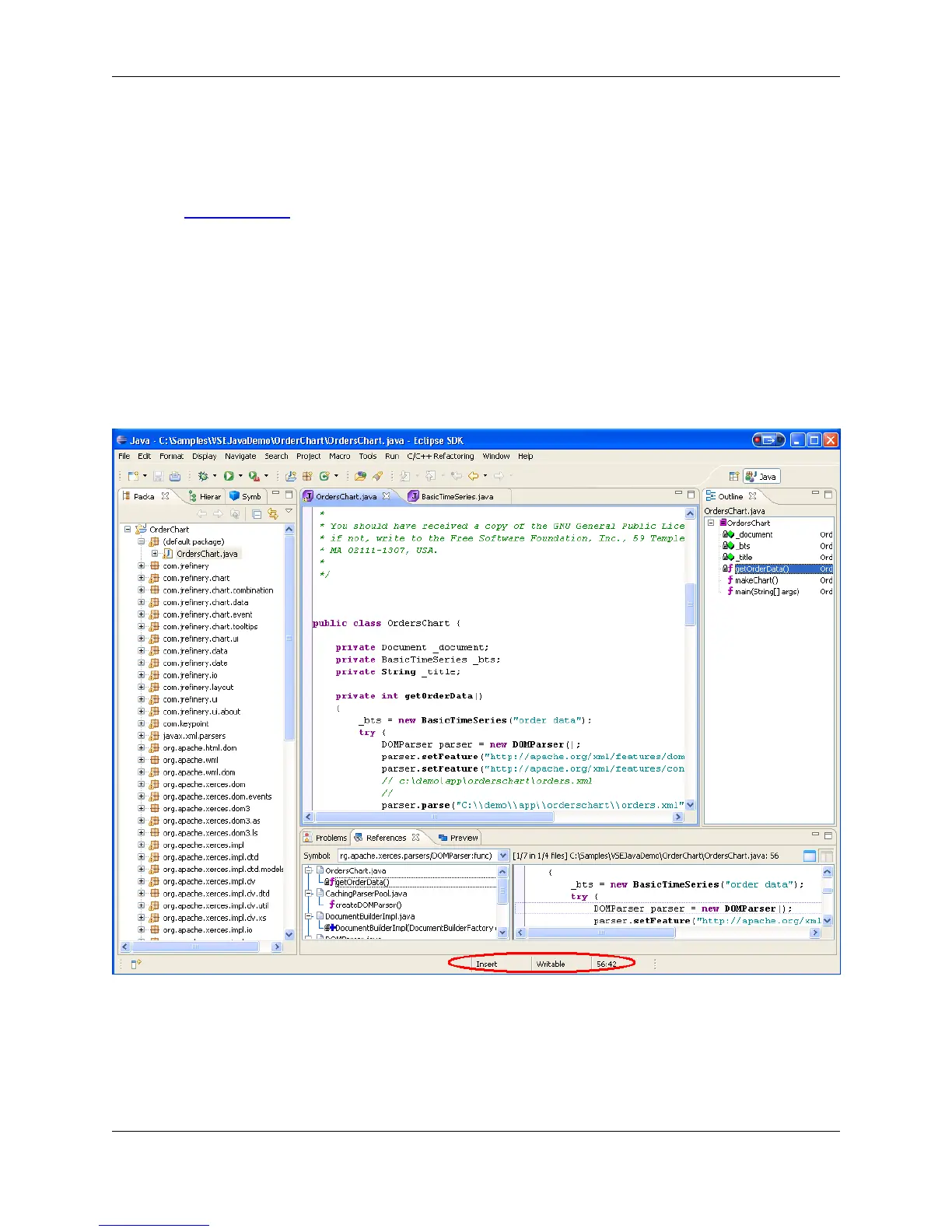 The status area for a perspective and an editor displays text messages. It indicates if the current mode is