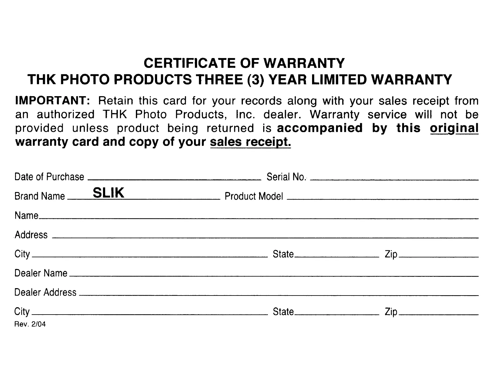 an authorized THK Photo Products, Inc. dealer. Warranty service will not be