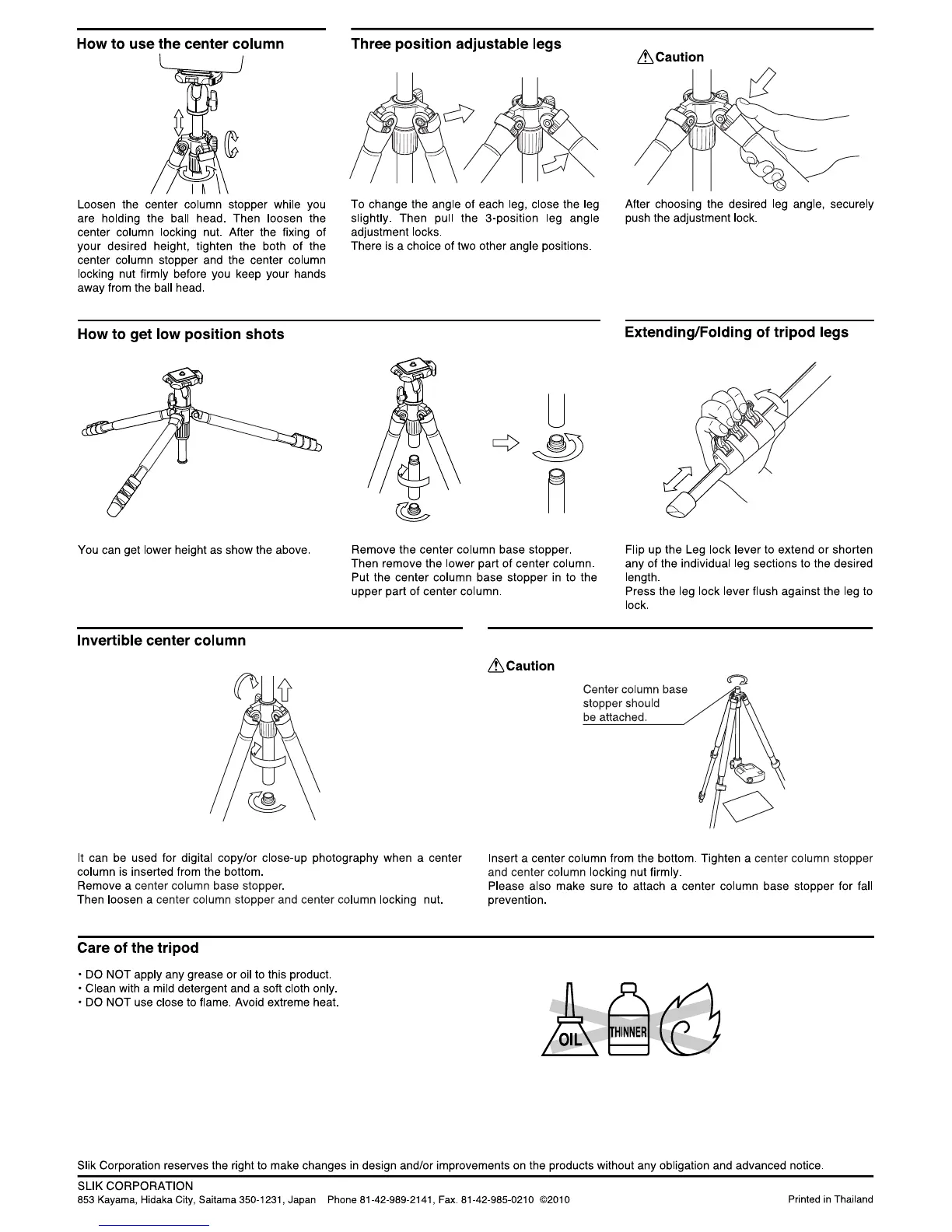 SLIK Sprint 150 - Tripod Operation and Adjustment; Center Column Adjustment; Three Position Leg Angles; Low Position Shots