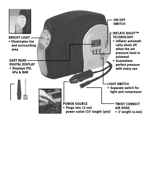 2. Push the ON/OFF button for the inflator to start. When the pressure gauge
