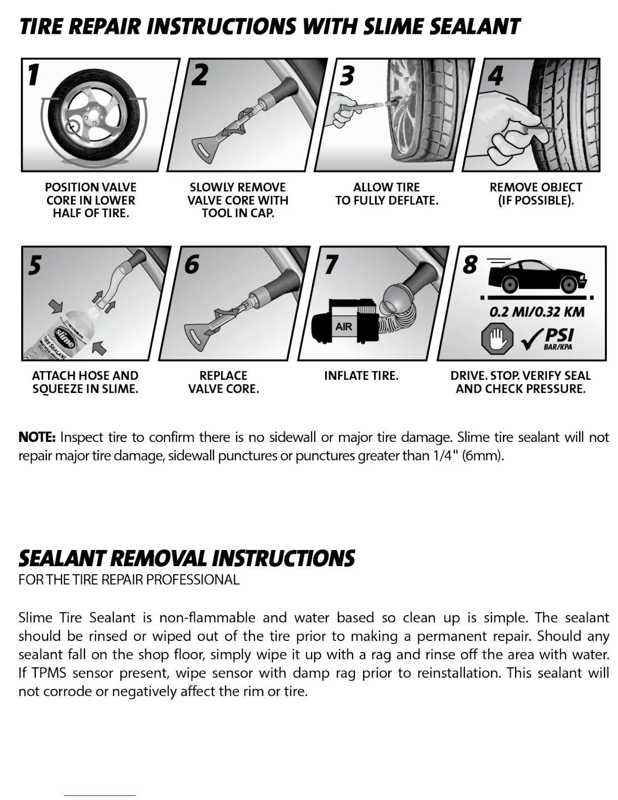 Slime 50063 - Tire Repair Procedure with Slime Sealant; Step-by-Step Repair Guide; Sealant Removal for Professionals