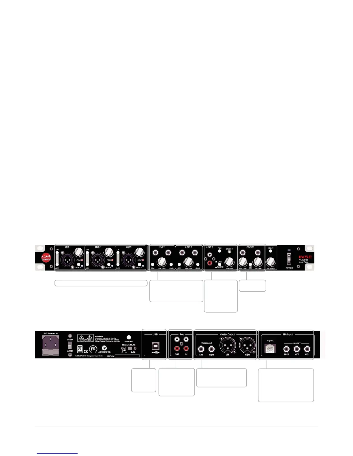 able phantom power, peak lights, and gain control can be found on the front of th unit (3 x inserts