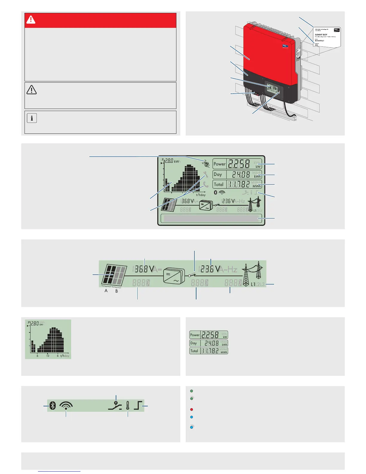 The power and energy of the inverter are displayed in three elds: Power, Day and Total. The