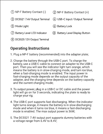 SmallRig NP-F - NP-F Battery Contacts; DC Output Terminals; USB-C Input;Output Terminal; Control and Indicator Features